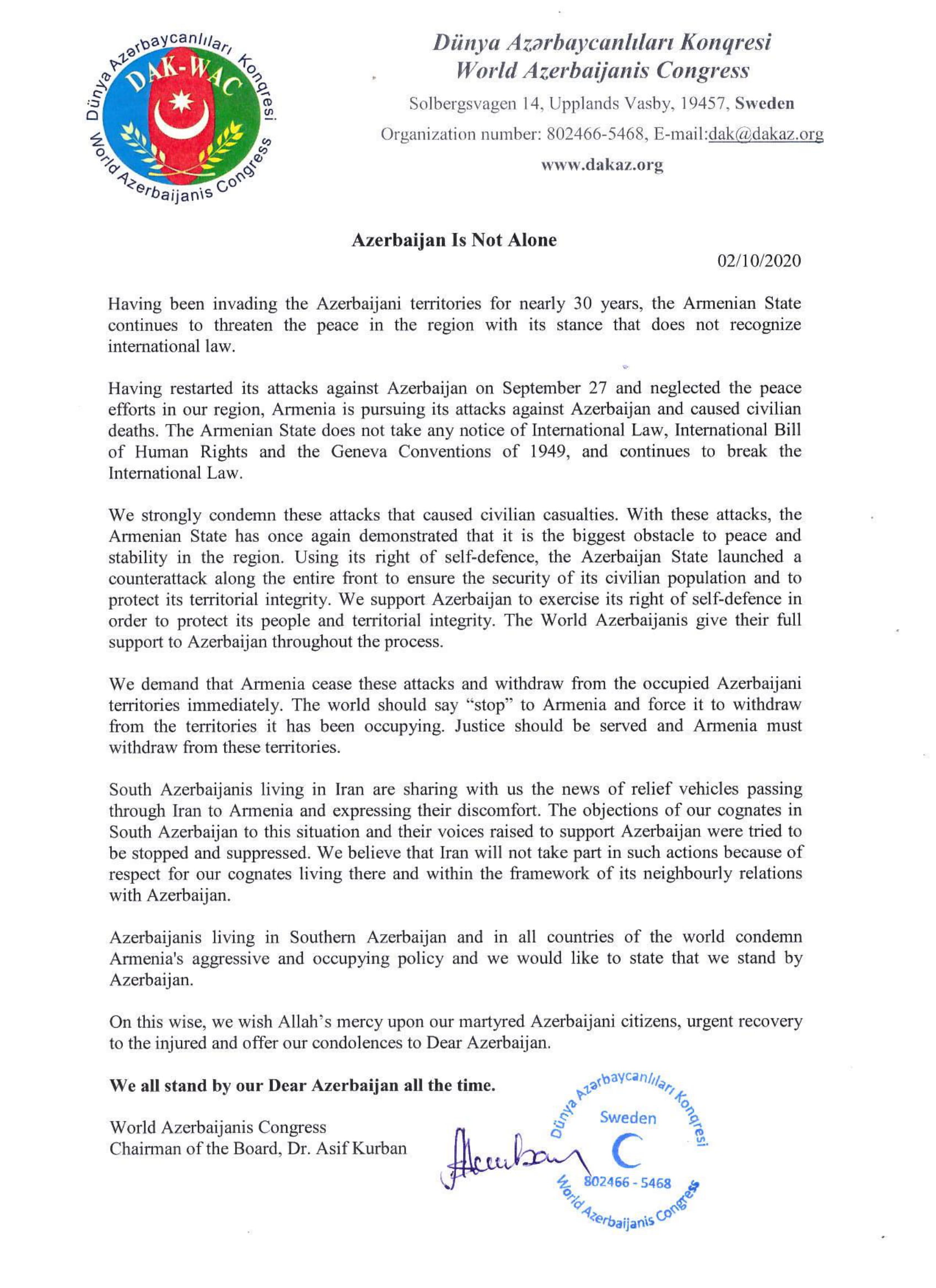 Dünya Azərbaycanlıları Konqresi Ermənistan silahlı qüvvələrinin mülki əhalinin məskunlaşdığı yaşayış məntəqələrini mütəmadi atəşə tutmasına və cəbhə xətti boyunca törətdiyi növbəti təxribatına etiraz olaraq bəyanat yayıb.
