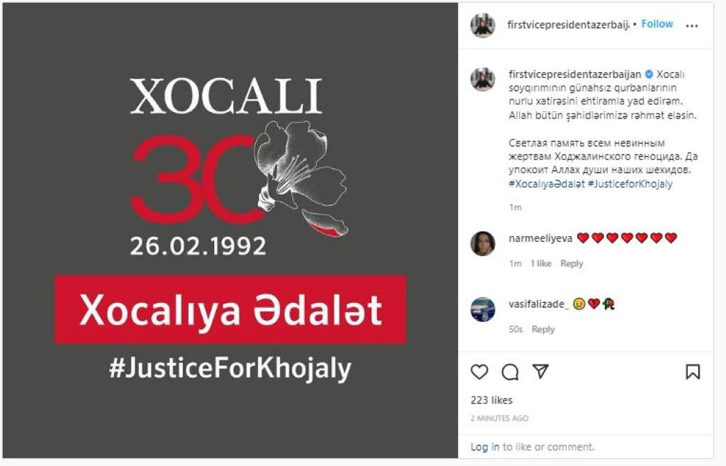 Azərbaycanın Birinci vitse-prezidenti Mehriban Əliyeva Xocalı soyqırımı ilə bağlı paylaşım edib.