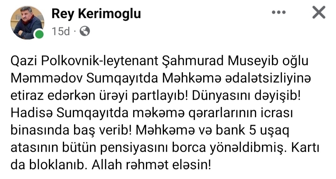 “Qazi, polkovnik-leytenant Şahmurad Museyib oğlu Məmmədov təqaüd kartında olan 100 manat pulunu bankomatdan çıxarmağa gedib. Lakin kartının bloklandığını görüb. Həmçinin onun bütün təqaüd pulunun məhkəmə tərəfindən borclarına yönəldiyi bildirilir. Bu səbəblərdən Ş. Məmmədov Sumqayıt şəhər Məhkəməsinə gedərək öz etirazını bildirib. Lakin bu zaman qəflətən ürəyi partlayaraq ölüb”.