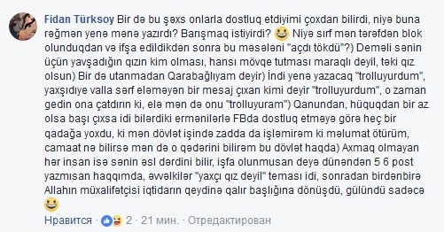 Belə ki, gənc “Facebook” səhifəsində qızı erməni-dostları vasitəsilə Gürcüstandan keçərək işğal olunmuş Qaradabağı ziyarət etməyə çalışmaqda günahlandırır. Bununla yanaşı o, qeyd edir ki, məhz erməni dostları xanımın səfərini gizlədərək onun pasportuna Ermənistan, eləcə də qondarma rejimin möhürünün vurulmasının qarşısı ala bilərlər.