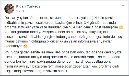 Gənc qız isə öz növbəsində bütün bunların böhtan olduğunu, status və skrinlərə inanmamağı qeyd edib. Həmçinin Fidan yazıb ki, Z.Ata ilə şəxsi münaqişəsi var. Bütün bunlar planlaşdırılmış formada edilir. Bu açıqlamadan sonra o “Facebook” səhifəsini bağlayıb.